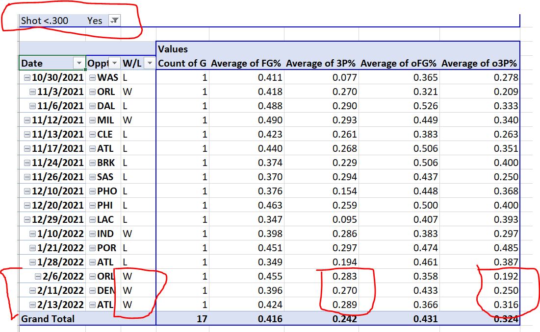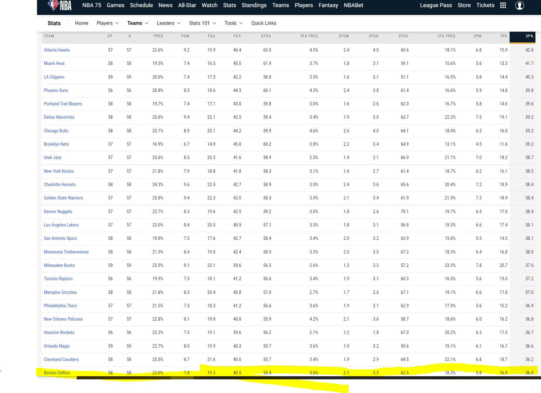 There's another stat I've been tracking which is the # of games we have won where we shot less than .300. Over the season's 59 games we have shot below .300 17 times, and only won 6 times...but 3 of those 6 were in the last 10 days - because the other team shot even worse. Whether that's our doing, theirs, or a combination of both, we need to dig deeper. But the data suggests that as long as we continue to defend well and be connected and give the other team bad shot opportunities we will be in the thick of things come playoff time, even if we miss our 3s.
