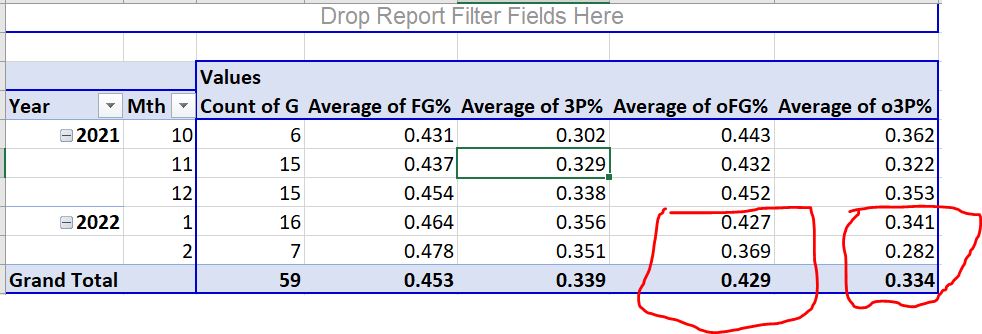 That said, we have been winning despite our mediocre 3fg shooting, why? I'm sure it drives everyone crazy to see our team of clankers letting it fly and building brick houses every game, but the flip side to it is that our defense has gone to another level in 2022. I did these splits this for another thread, you can see how even if our 3fg is mediocre, those we have been playing have been worse on average: