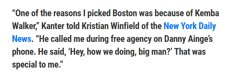I saw this article and thought it was very intersting that Kemba recruited Kanter -- using Ainge's phone! Maybe we will get some team harmony this year. There's some other interesting Kanter facts in the article linked below.