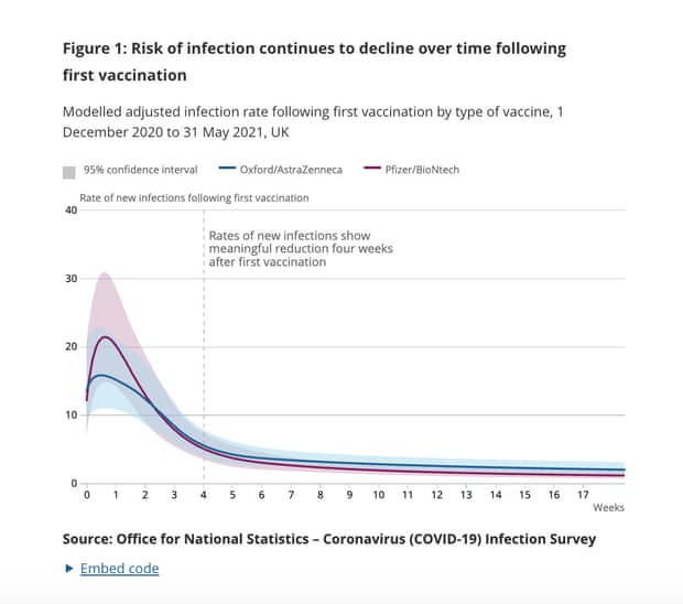 The raw figures show the risk of infection actually going up after the first vaccination, “peaking at around 16 days, followed by a strong decrease to around one month”. But the ONS offers a few possible explanations, including: