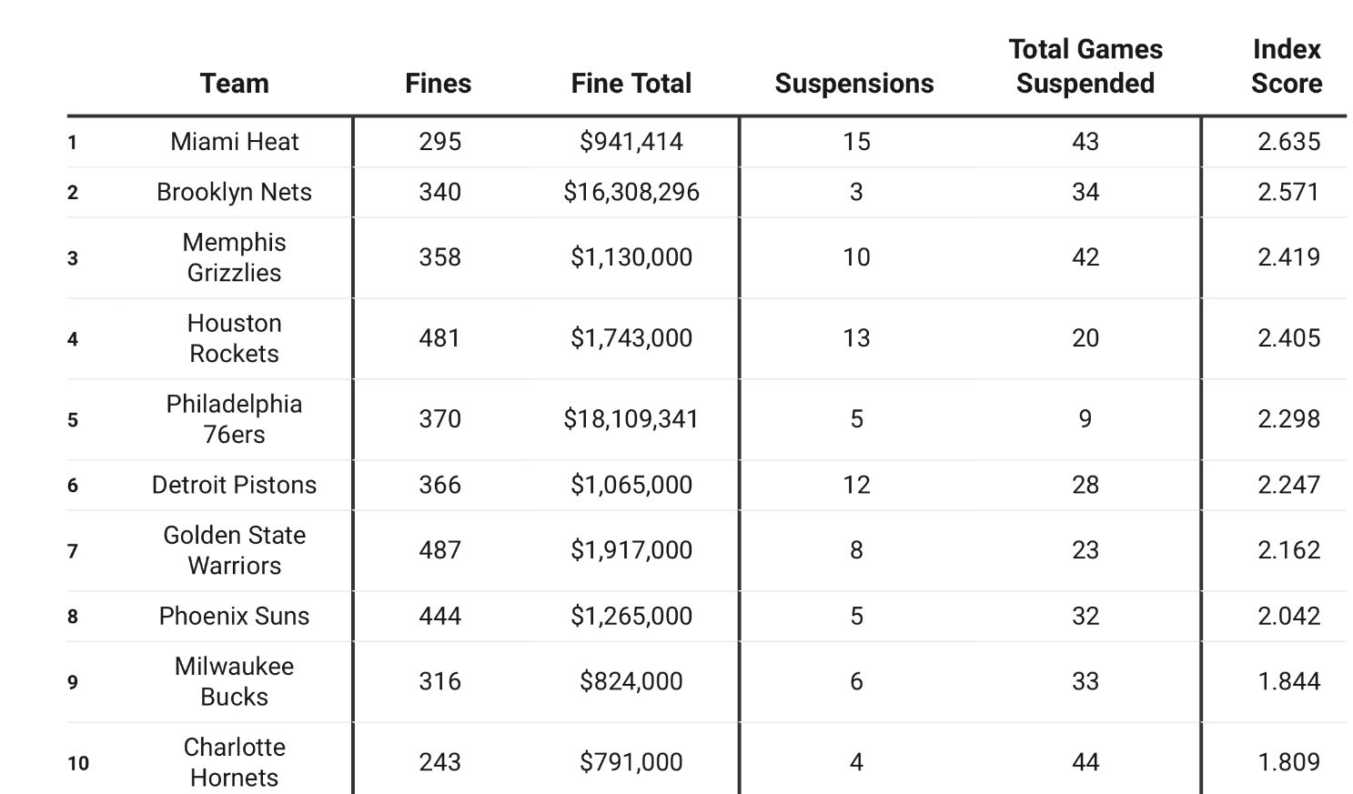 The full list: https://www.rotowire.com/basketball/article/the-nba-dirtiest-teams-fines-suspensions-rankings-96171