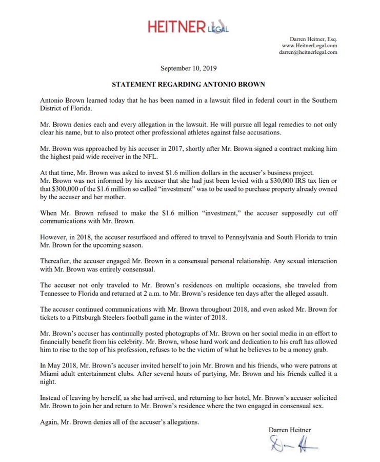 “Mr. Brown denies each and every allegation in the lawsuit,” said a statement from Darren Heitner, a lawyer representing Brown. “He will pursue all legal remedies to not only clear his name but to also protect other professional athletes against false accusations.”