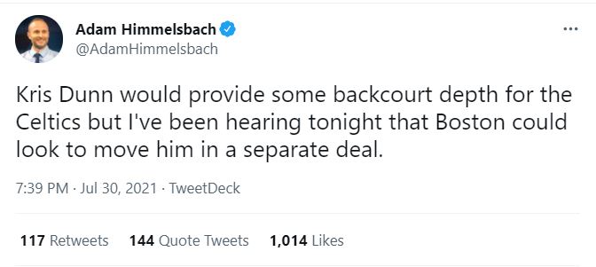 The way I see it: Dunn is our hedge against Smart leaving. Bet they’re trying to re-sign both of them and whichever does not re-sign will be moved. If they both re-sign, ship Dunn.