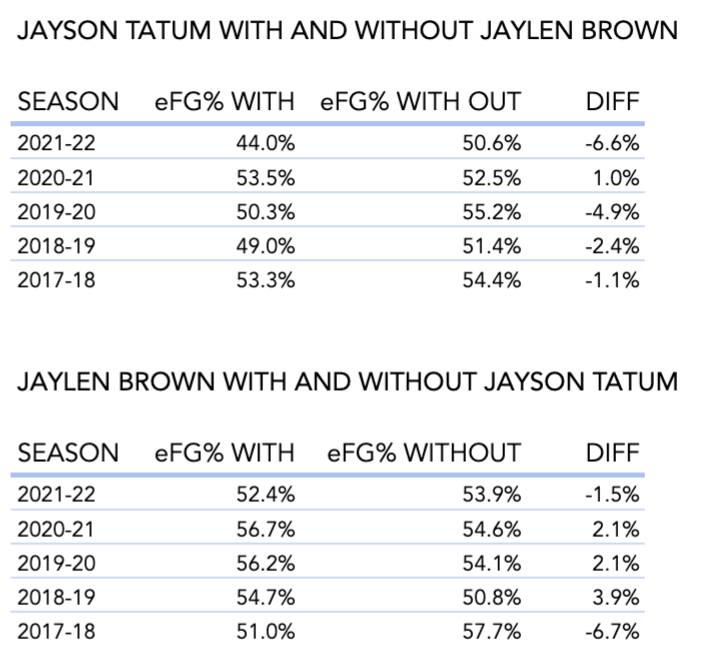 The lesson I see w/ Tatum and Brown is that they can certainly play together and the team can do quite well with them on the floor, but you just can't design a gameplan around those two guys. They don't play off one another, they don't have a two-man game, and neither of them is an average or better creator.