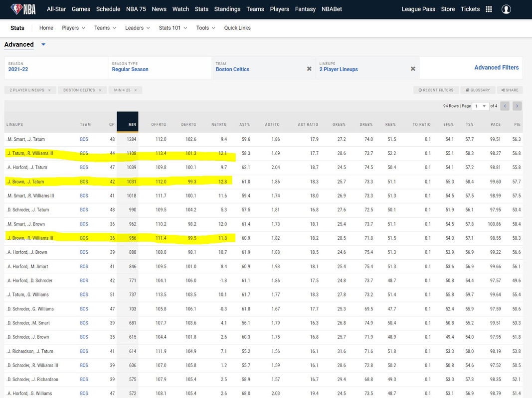 But again I see his role as more of a supplementary role, in that he makes everyone better, whether it's defensively, offensively as a rim roller as well as as a rebounder and passer finding cutters. Based on the stats and the eye test I still feel the two players we have that impact winning the most are Tatum and Brown, and they both make each other better. If you look at the net rating of our most used 2 man lineups, Tatum and Brown have the highest. That said, Timelord is right up there with either of them: