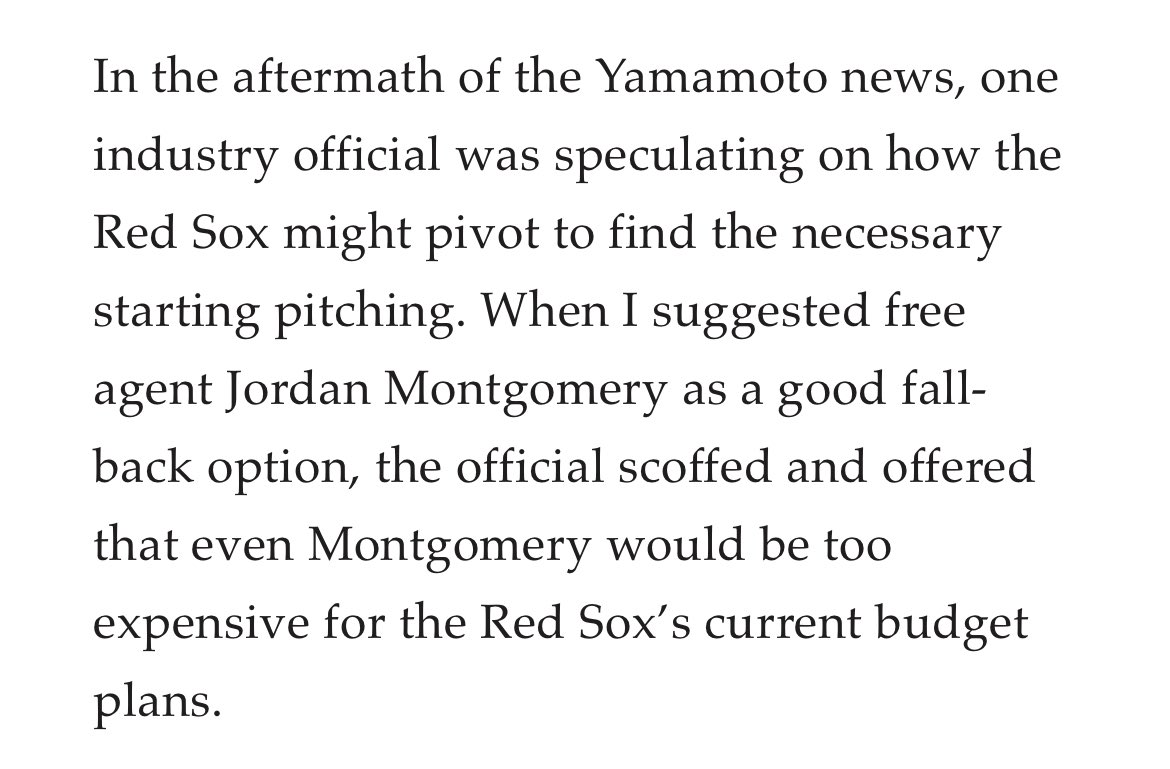 This isn't about "overpaying" for Montgomery or what he's truly worth, but if the Sox are literally telling everyone that a 150M+ contract isn't in their "budget" then that's just truly pathetic. Also basically tells you they are getting no big-names this offseason (not Snell, Monty, etc.). And btw, the Sox are still about 75M under the luxury tax.