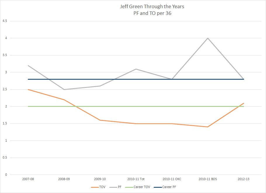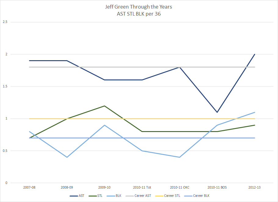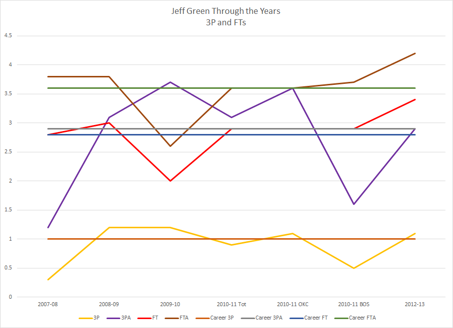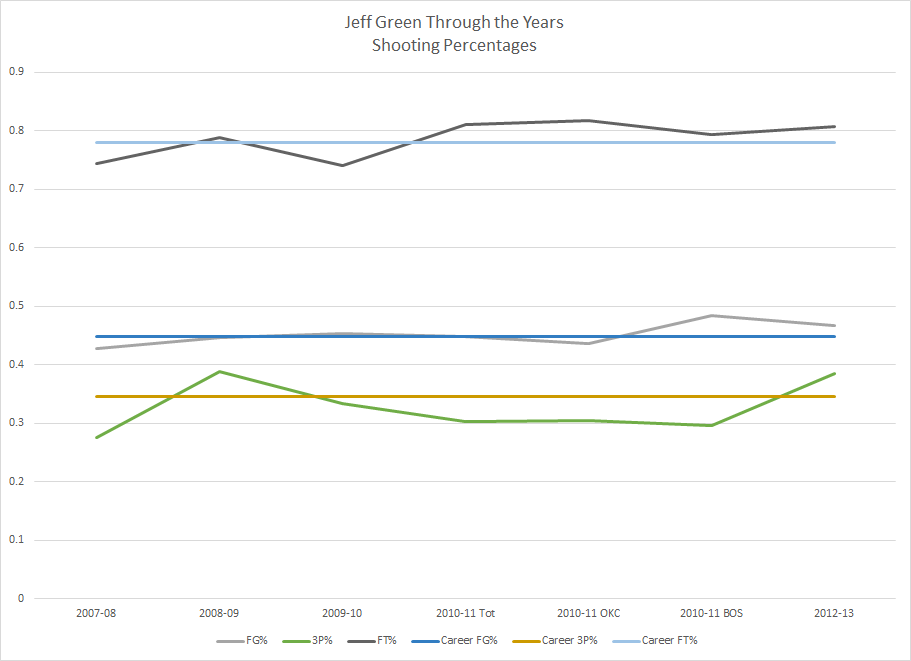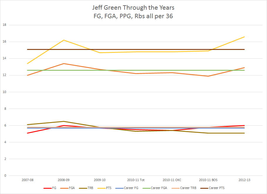 What I'm suggesting, like Roy, is that at least over significant sample sizes (i.e. whole seasons) Jeff Green has been remarkably consistent in terms of almost any stat you can think of, traditional or advanced.