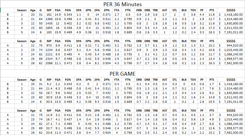 Here's a quick "player A vs player B" type of comparison. Data is a couple days old, but it's the first 5 seasons of 2 players (Bradley's 5th season is very young). Then there's a comparison of the same two players by age, since Bradley was actually 20 when he started.