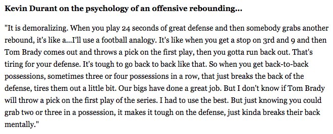 our strength is our immaculate set of role players that will make KD the best alpha superstar he can possibly be. I can envision us bringing the entire team and having each player just explain to KD how they will help him lift his game.